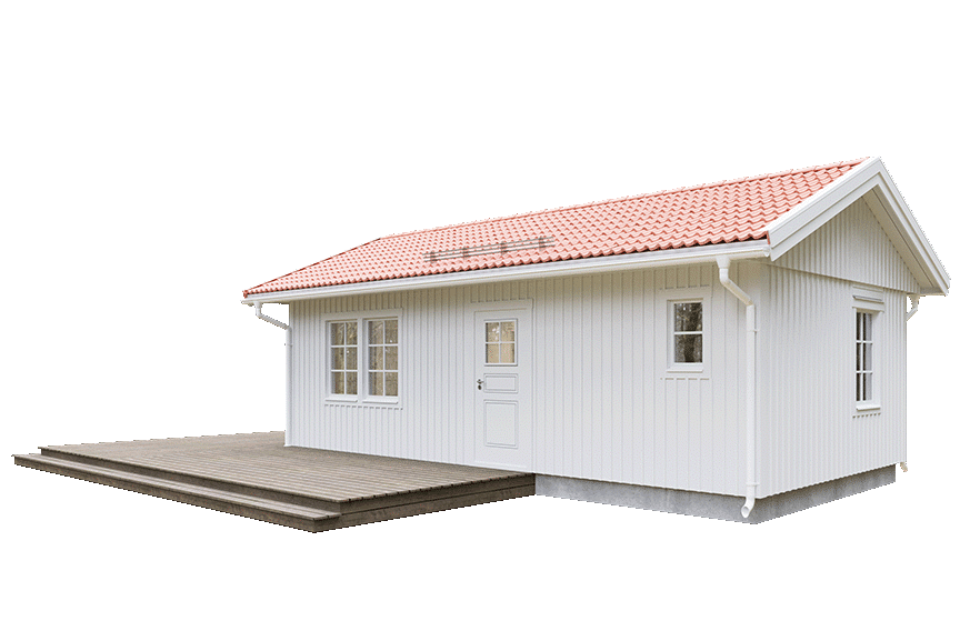 Kompakt fritidshus eller gäststuga på precis över 40 kvadratmeters byggyta. Enplanshuset har två sovrum och vardagsrum/kök i öppen planlösning med ryggåstak som ger rymd.