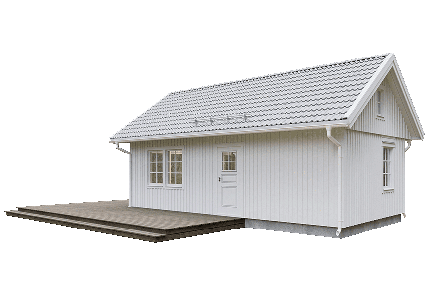 Kompakt fritidshus eller gäststuga med två sovrum och badrum samt möjlighet till fler sovplatser på loftet. Detta lofthus har vardagsrum/kök i öppen planlösning med ryggåstak som ger rymd, och fint ljusinsläpp genom generösa fönsterpartier.