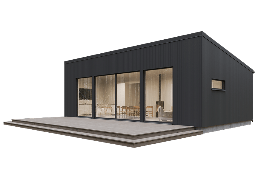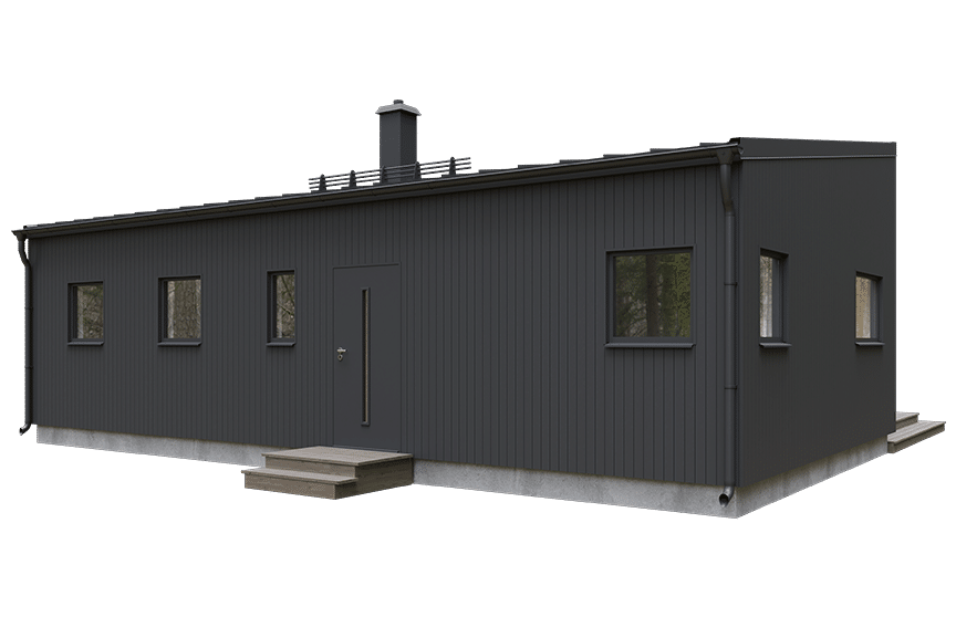 Yteffektivt fritidshus med tre sovrum. Hela husserien Stil karaktäriseras av sina 2,70 m höga fönsterpartier och skjutdörrar som ger ett massivt ljusinsläpp och närkontakt med utemiljön, och pulpettaket som ger rymd i hela huset.