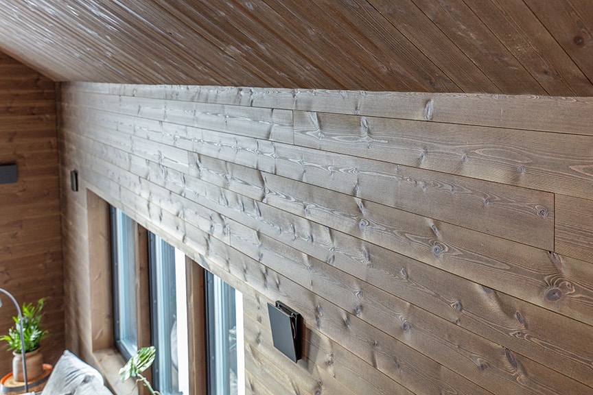 Vår rekommendation för det mysiga, murriga lodge-uttrycket är betsad brun träpanel. Ytan är borstad vilket ger den en tydlig trästruktur. Profilen heter slätspont, vilket innebär att panelbrädorna sitter tätt intill varandra utan mellanrum vilket medför ett stilrent, modernt uttryck.